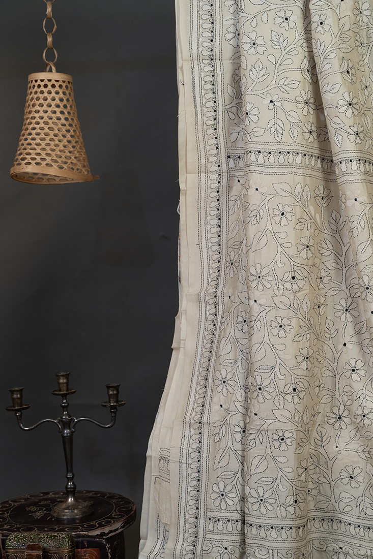 Bolpur – Hand-Stitched Beige Floral Motif Nakshi Kantha Saree