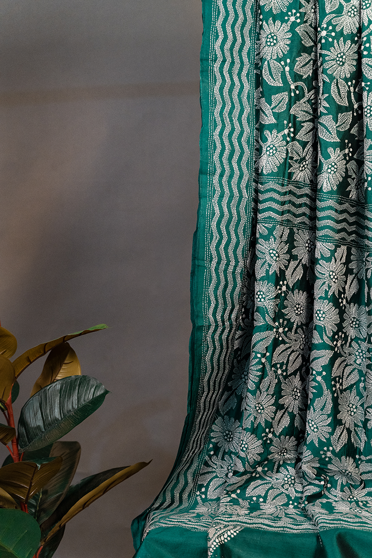 Bolpur – Hand-Stitched Sea Green White Floral Nakshi Kantha Saree