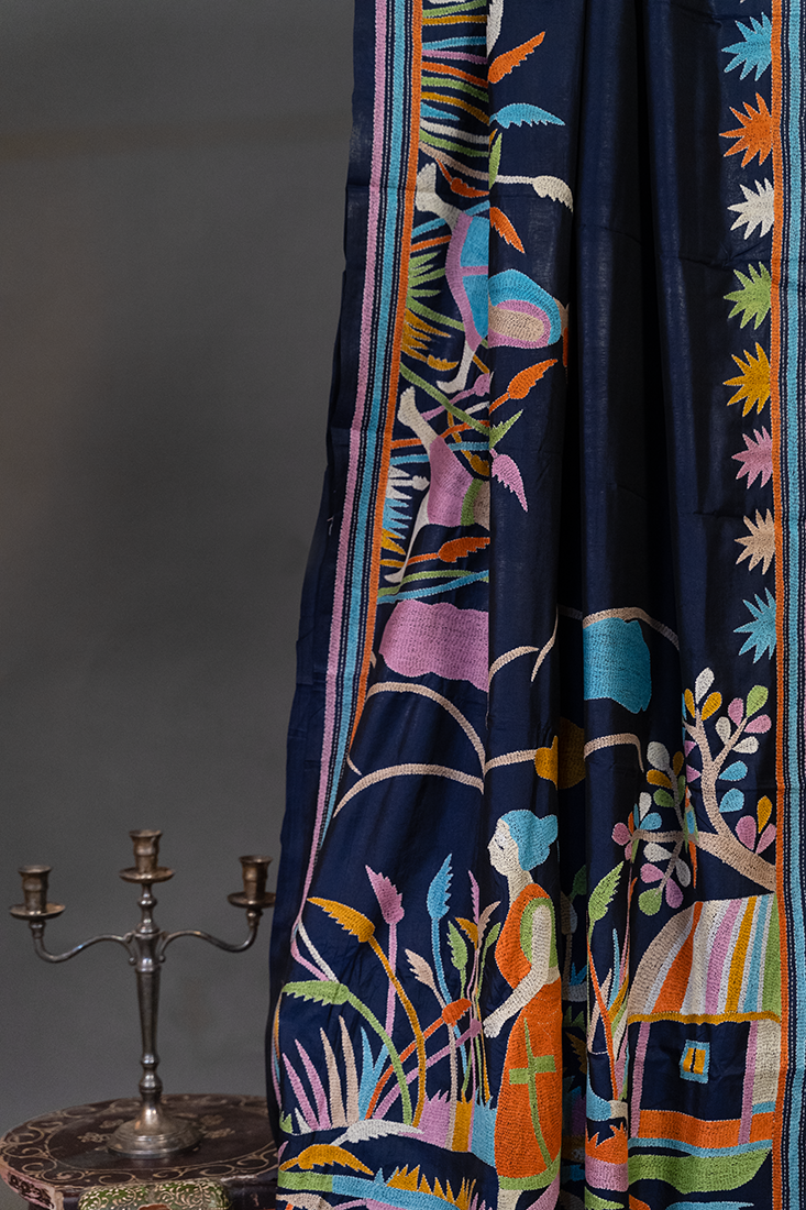 Bolpur – Hand-Stitched Dark Blue Gachi Tussar Nakshi Kantha Saree