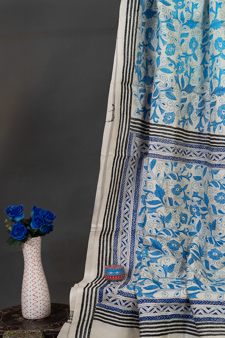 Bolpur – Hand-Stitched Beige Blue Floral Motif Nakshi Kantha Saree