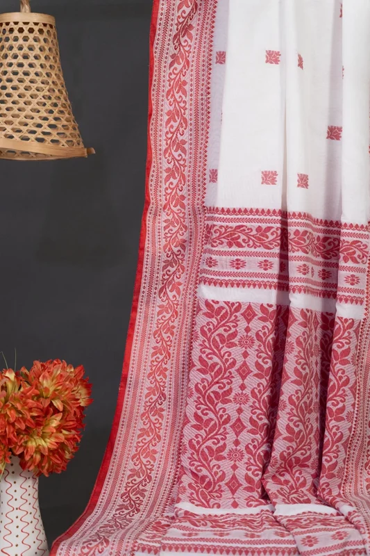 Phulia – White and Red Floral Design Pure Cotton Handloom Saree
