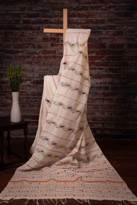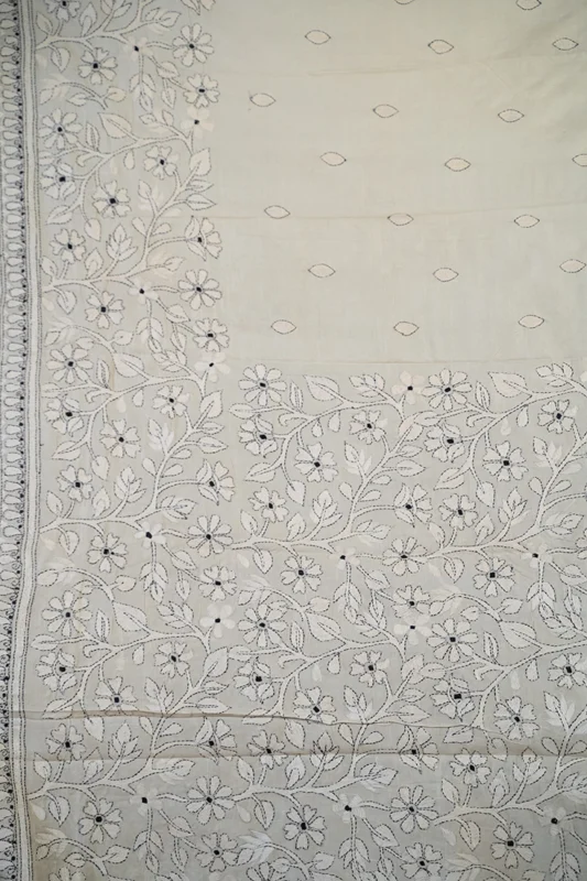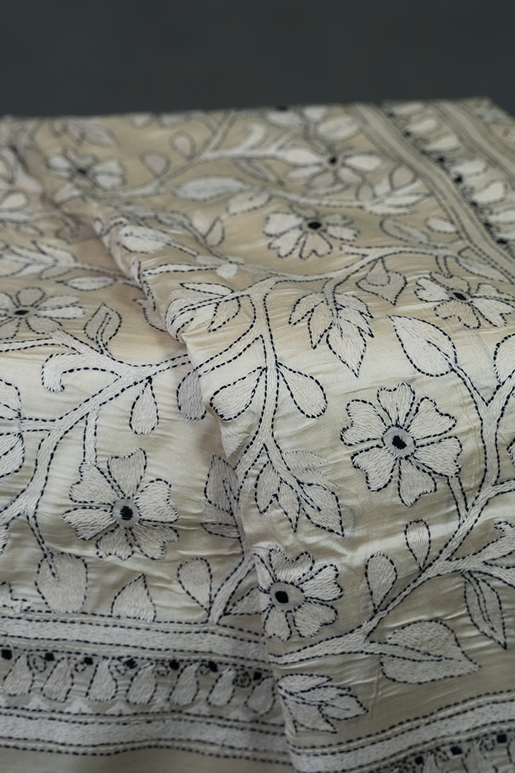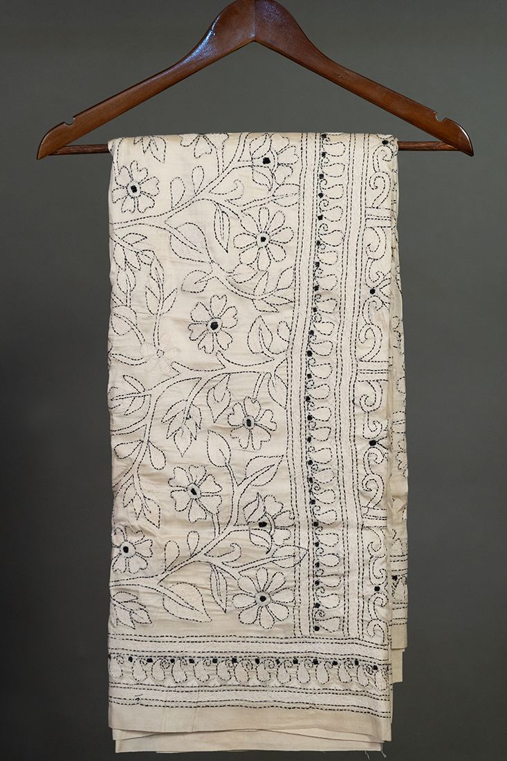Bolpur – Hand-Stitched Beige Floral Motif Nakshi Kantha Saree