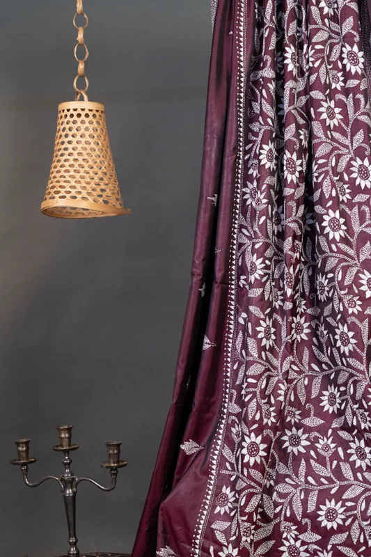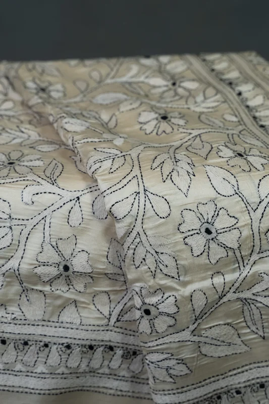 Exquisite flower motifs bloom across the fabric in striking white and black Nakshi Kantha work. Each hand-stitched detail showcases centuries-old heritage and artisan mastery. The lustrous tussar silk drapes with graceful movement, transforming this saree into timeless wearable art.
