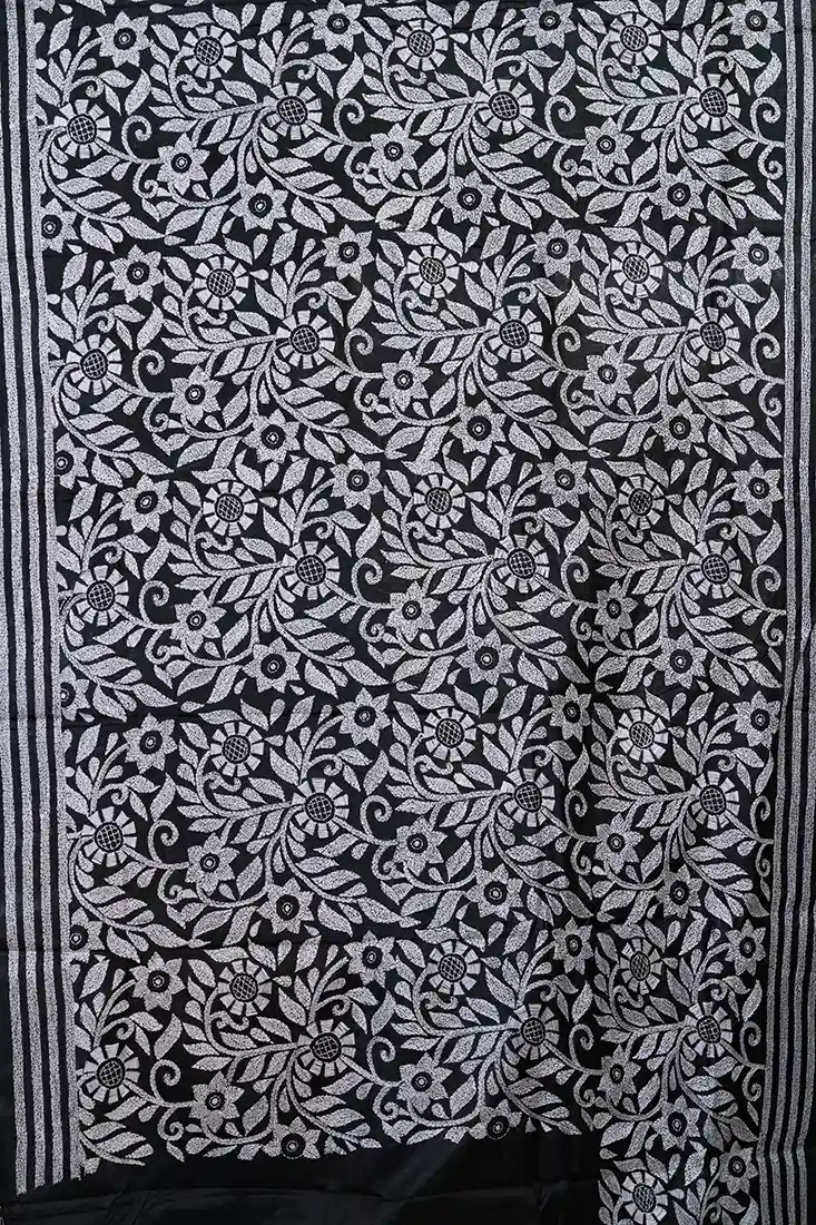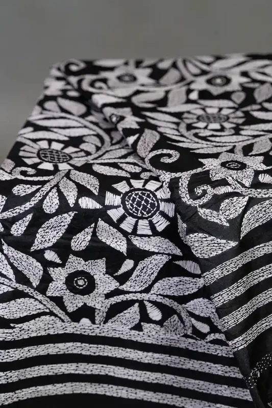 Bolpur – Hand-Stitched Black White Floral Nakshi Kantha Saree