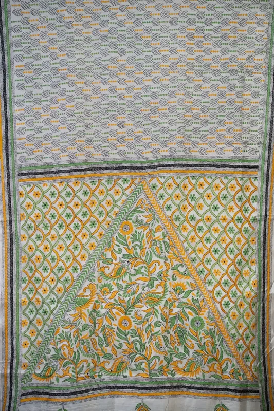Cheerful sunflower motifs dance across the fabric in vibrant yellow and green Nakshi Kantha work, celebrating life and abundance. Each hand-stitched detail is a testament to centuries-old heritage and artisan artistry. The lustrous silk drapes beautifully, transforming this saree into wearable sunshine.