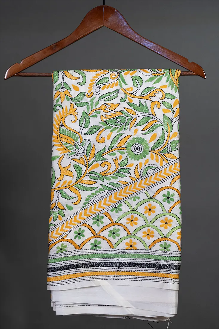 Bolpur – Hand-Stitched White Sunflower Motif Nakshi Kantha Saree
