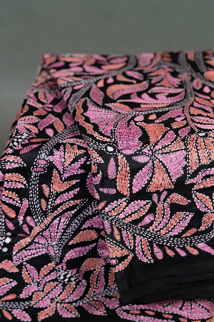Bolpur – Hand-Stitched Black Pink Floral Nakshi Kantha Saree