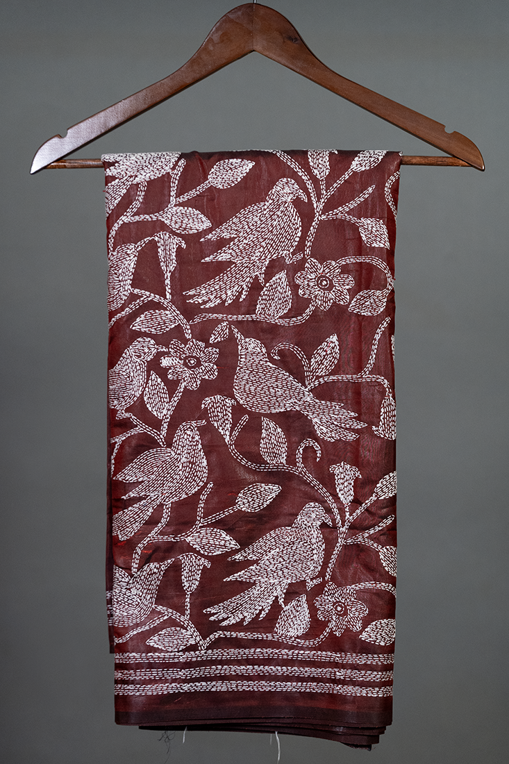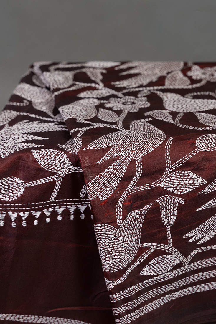 Embrace rich elegance in this maroon silk saree, Handwoven over two months by women artisans in Bolpur—the revered heartland of Kantha embroidery.