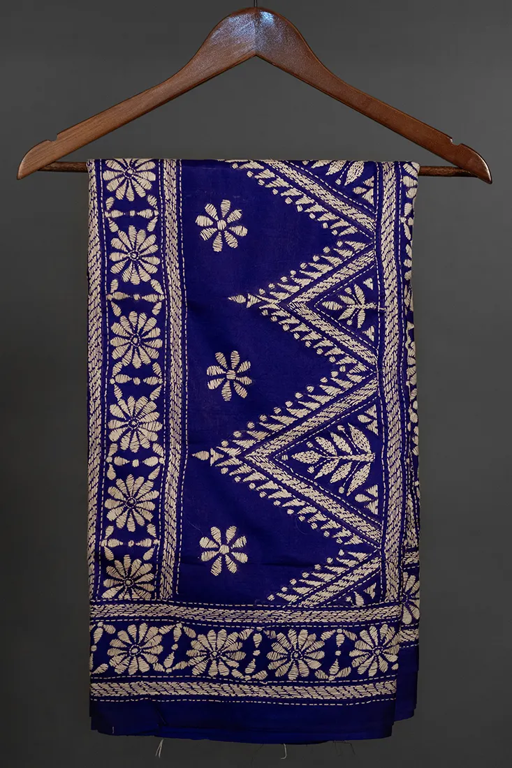 Bolpur – Blue Floral and Vine Motif Khesh Cotton Kantha Saree