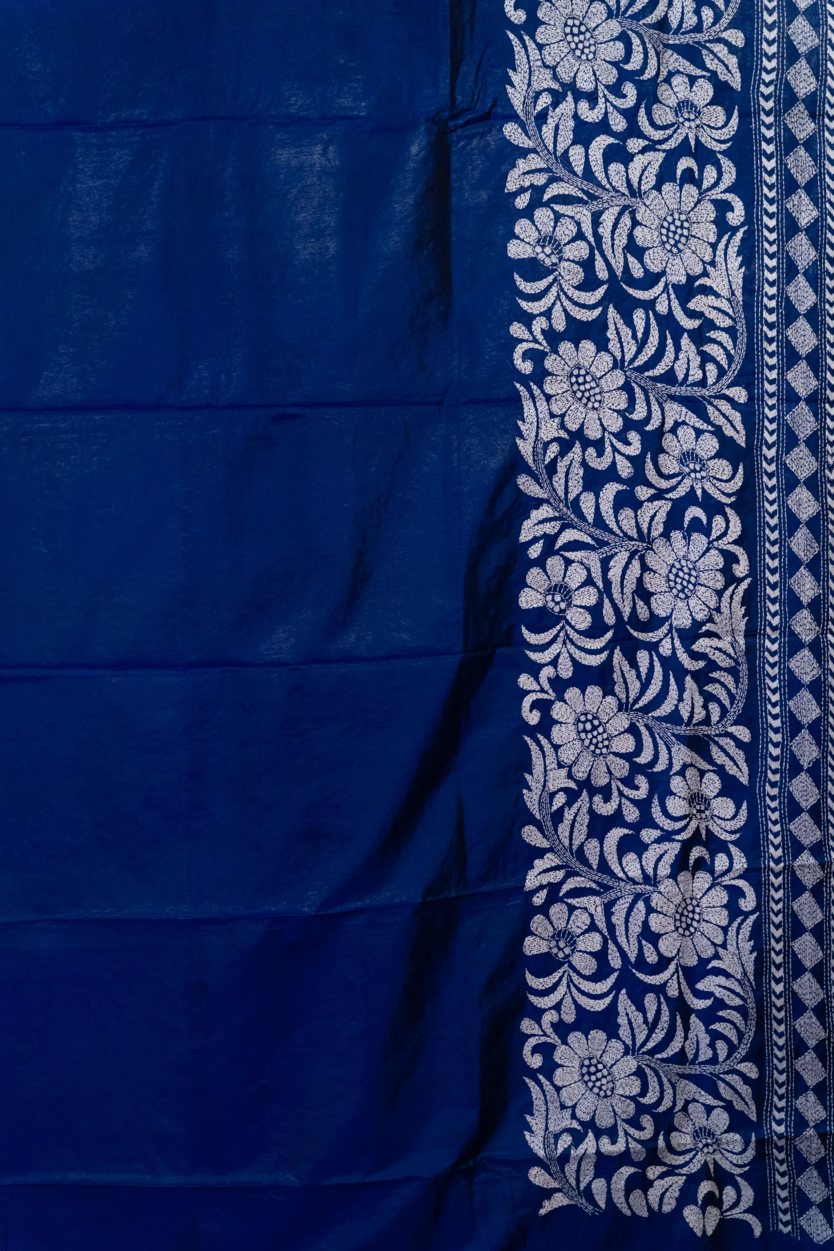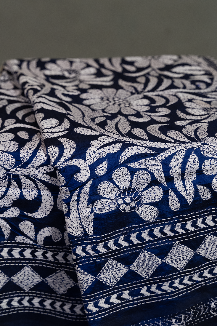 Immerse yourself in timeless elegance with this rich indigo blue Bangalore silk saree, Handwoven over two months by women artisans in Bolpur—the revered heartland of Kantha embroidery.