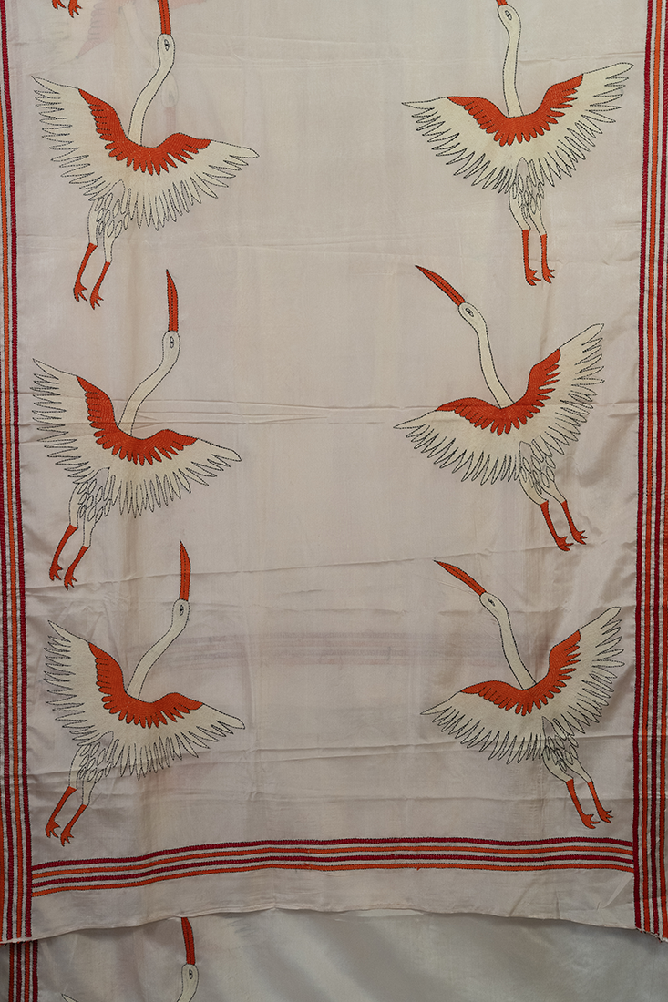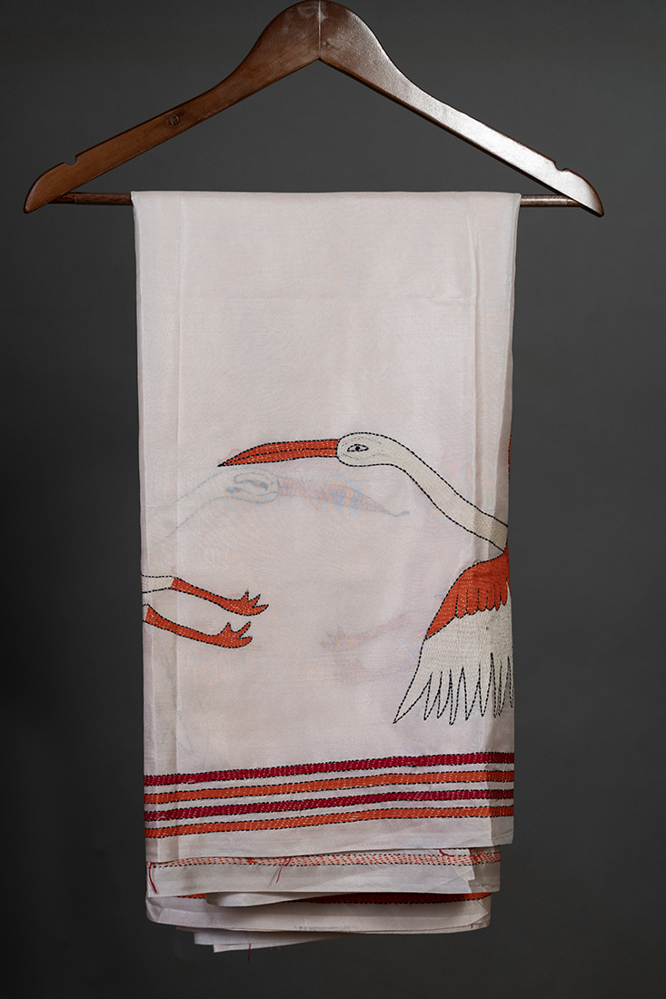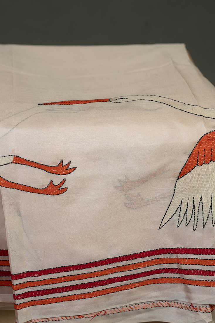 Graceful stork motifs soar across the fabric in vibrant orange and white Nakshi Kantha work, symbolizing grace and new beginnings. Each hand-stitched detail is a testament to centuries-old heritage and artisan artistry. The lustrous silk drapes beautifully, transforming this saree into wearable poetry.