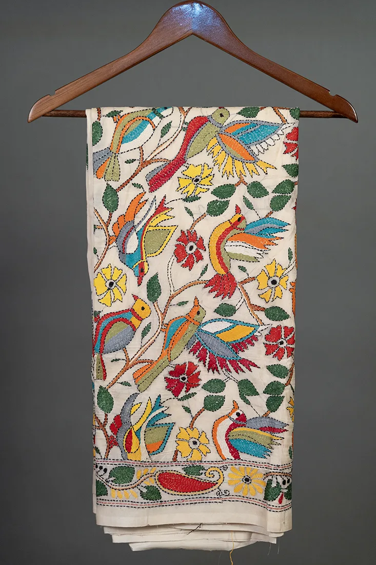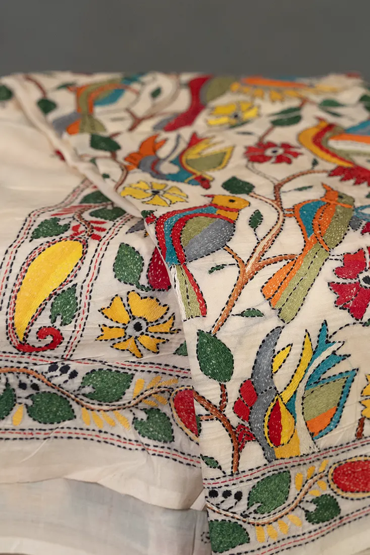Bolpur – Hand-Stitched Beige Bird Motif Nakshi Kantha Saree