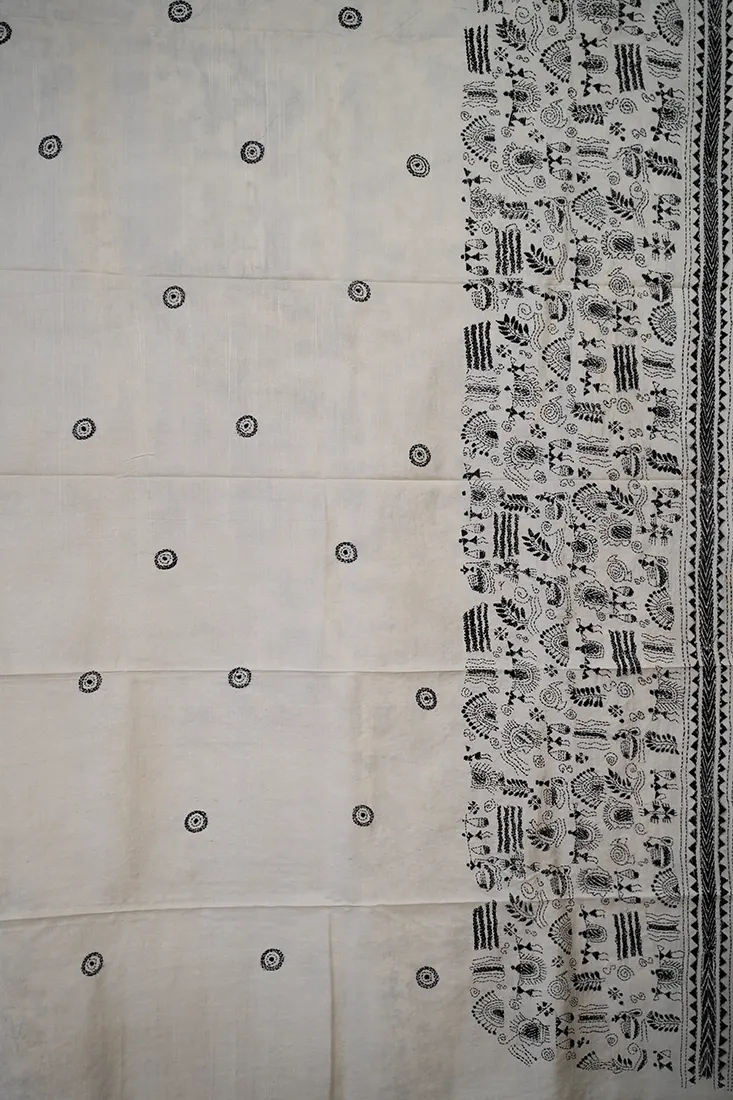Striking tribal motifs emerge across the fabric in deep black Nakshi Kantha work, celebrating indigenous heritage and artistic boldness. Each hand-stitched detail is a testament to centuries-old artistry merged with contemporary aesthetic. The lustrous tussar silk drapes with natural grace, transforming this saree into statement wearable art.
