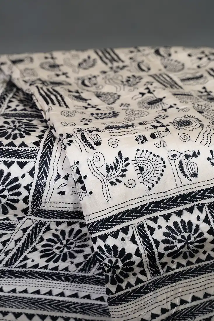 Black tribal motif Nakshi Kantha embroidery