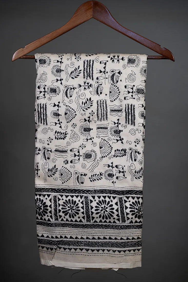 Bolpur – Hand-Stitched Beige Tribal Motif Nakshi Kantha Saree
