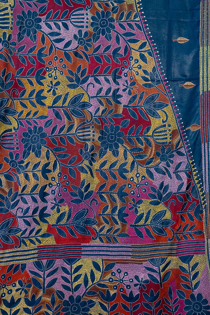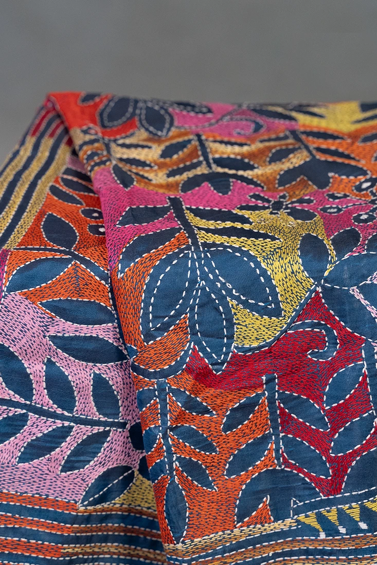 Bolpur – Hand-Stitched Dark Blue Floral Reverse Kantha Saree
