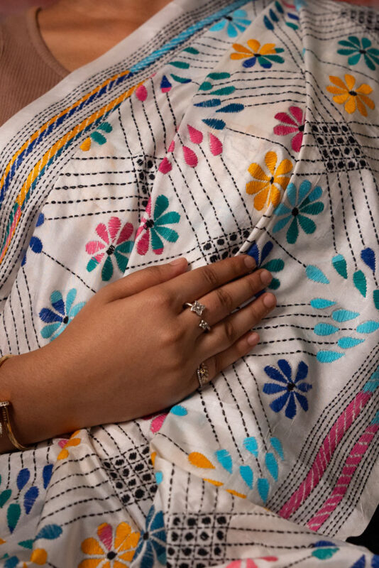 Hand-stitched by artisans in Kirnahar village, Bolpur—renowned for Kantha embroidery—this saree features vibrant blues, pinks, yellows, teals, and blacks weaving lively floral and intricate geometric patterns across pristine white silk.