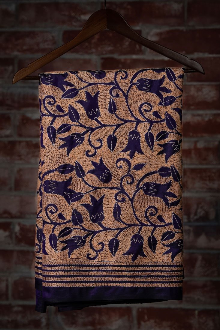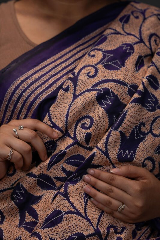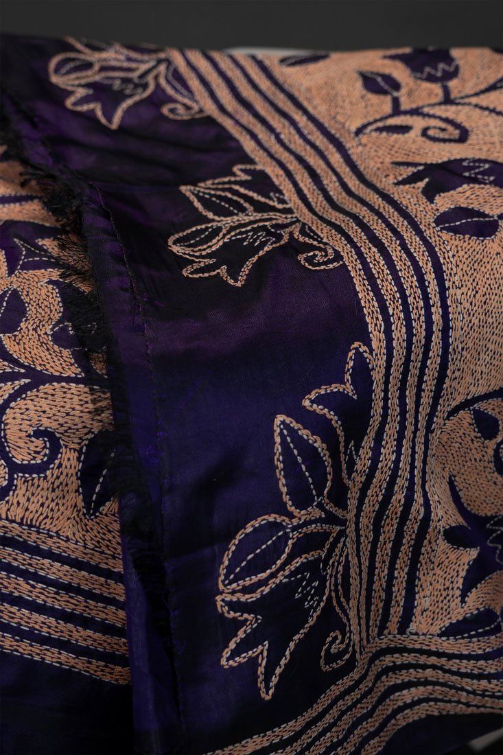 Meticulously hand-stitched by artisans in Kirnahar village, Bolpur—renowned for its Kantha tradition—this saree showcases dense beige threadwork that creates a richly textured canvas. From this intricate base, lush purple floral and vine motifs emerge, offering striking contrast and visual depth.