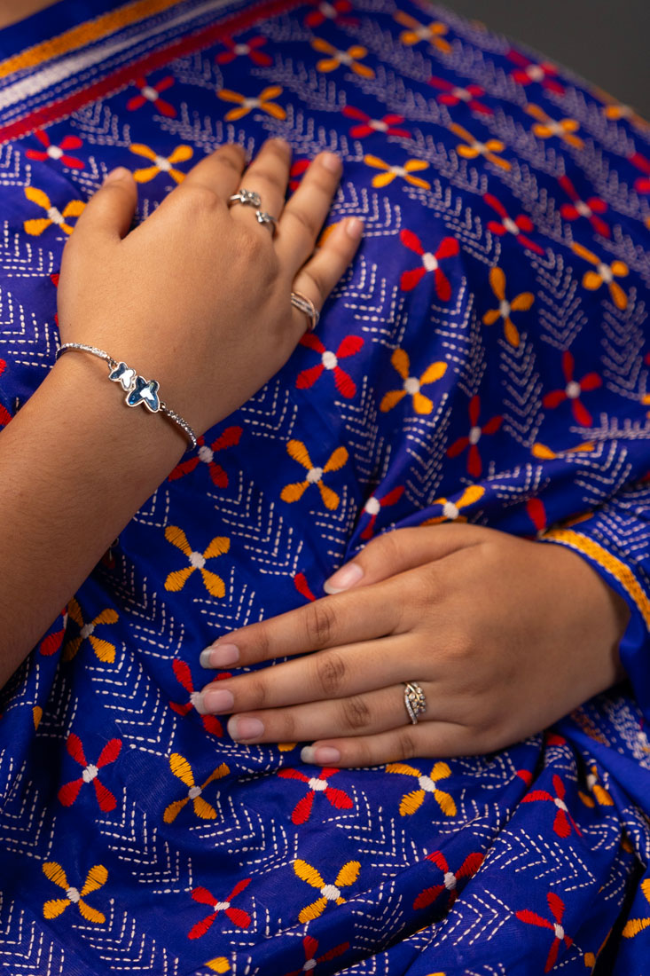 Adorn yourself in the festive spirit with this royal blue Blended Silk saree, brought to life through vibrant Nakshi Kantha embroidery.