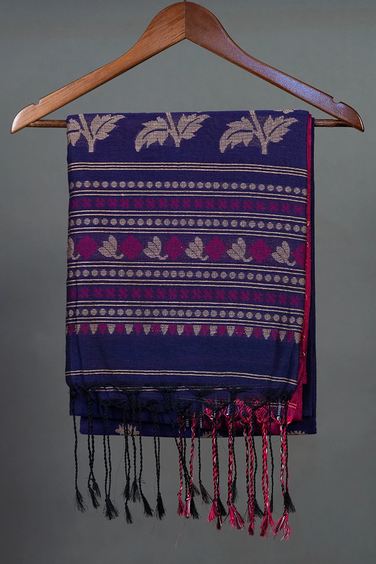 Embrace regal romance in this rich deep violet Pure cotton saree, Hand-Stitched by master artisans in Phulia, Nadia—the legendary home of Bengal's finest Tant weaving.