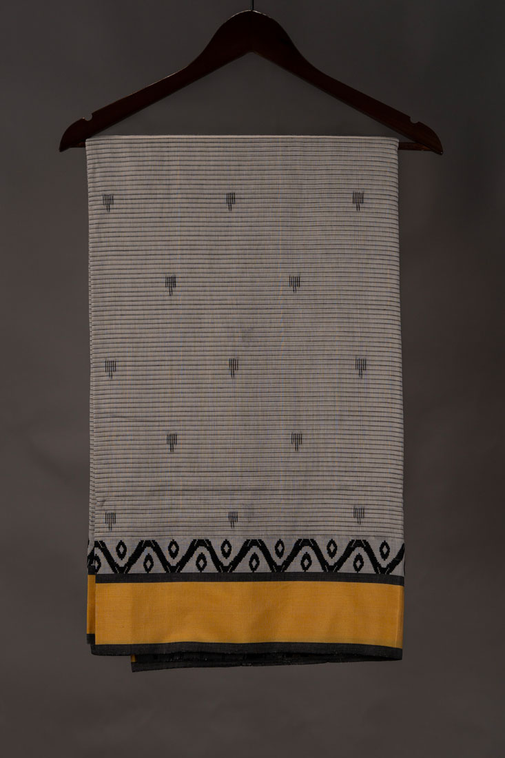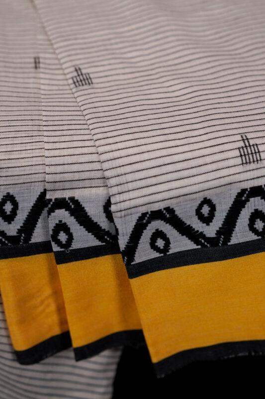 Handwoven by skilled artisans, this saree highlights the region’s signature weaving finesse. The soft grey body features fine black lines and subtle butis, strikingly framed by a vivid yellow border and intricate black-grey geometric edging—a perfect harmony of tradition and modern minimalism.