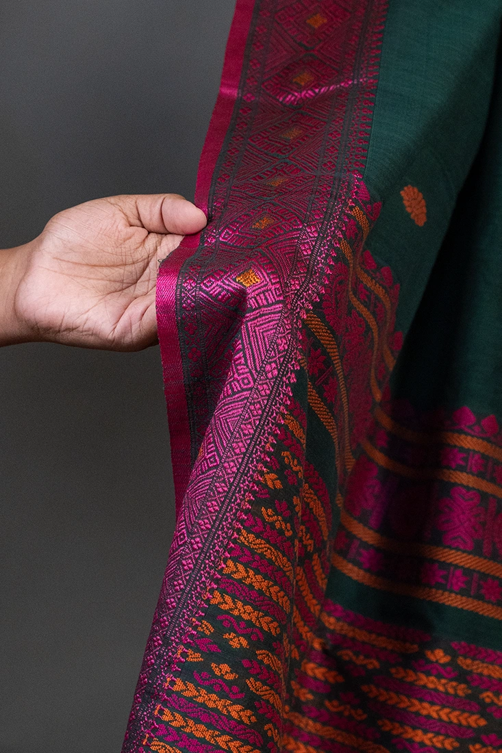 Embrace contemporary artistry in this vibrant green Pure cotton saree, Hand-Stitched by master artisans in Phulia, Nadia—the legendary home of Bengal's finest Tant weaving.
