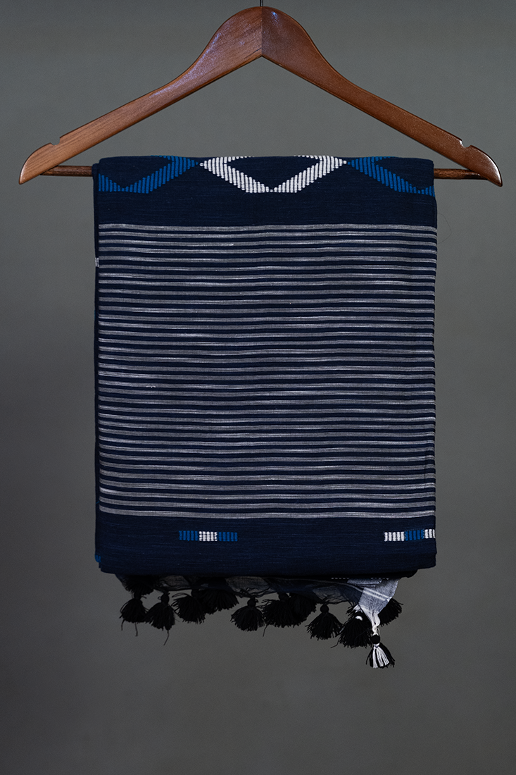 Embrace contemporary sophistication in this stunning midnight blue Khadi cotton saree, Hand-Stitched by master artisans in Phulia, Nadia—the legendary home of Bengal's finest Tant weaving.
