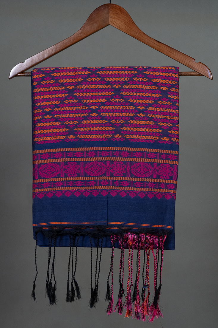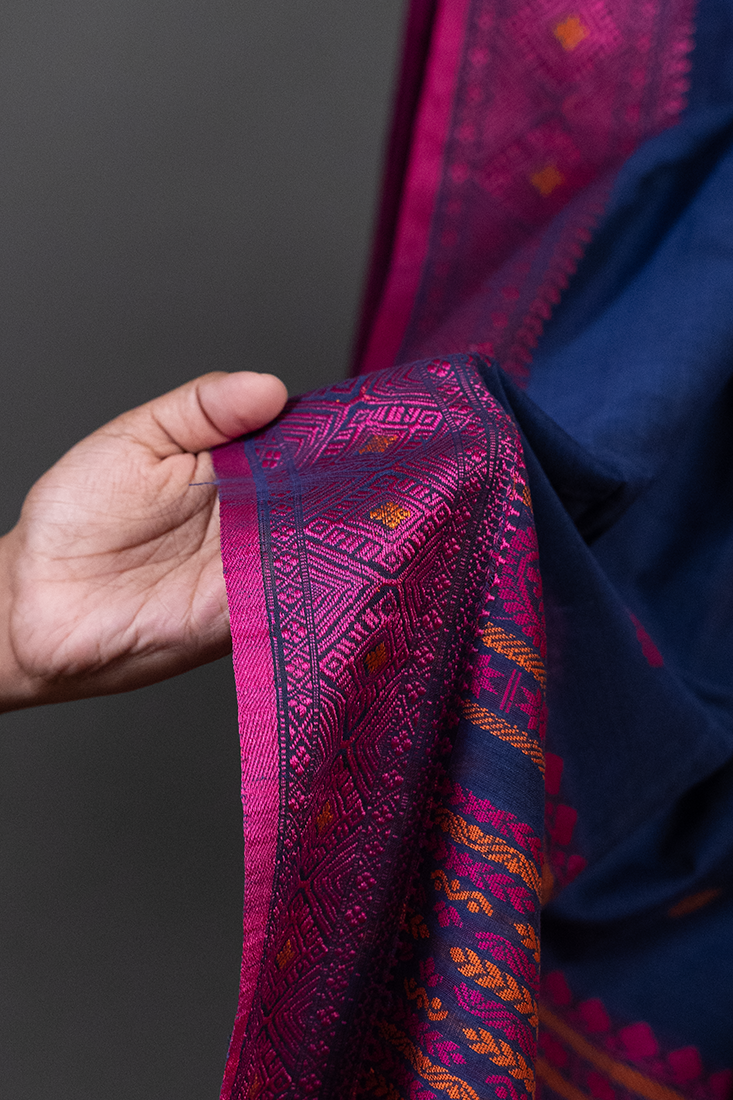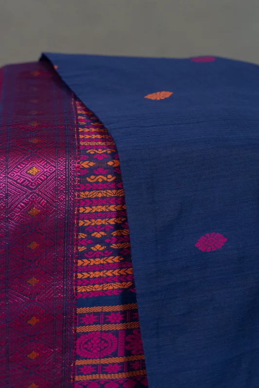 Embrace sophisticated style in this deep navy blue Pure cotton saree, Hand-Stitched by master artisans in Phulia, Nadia—the legendary home of Bengal's finest Tant weaving.