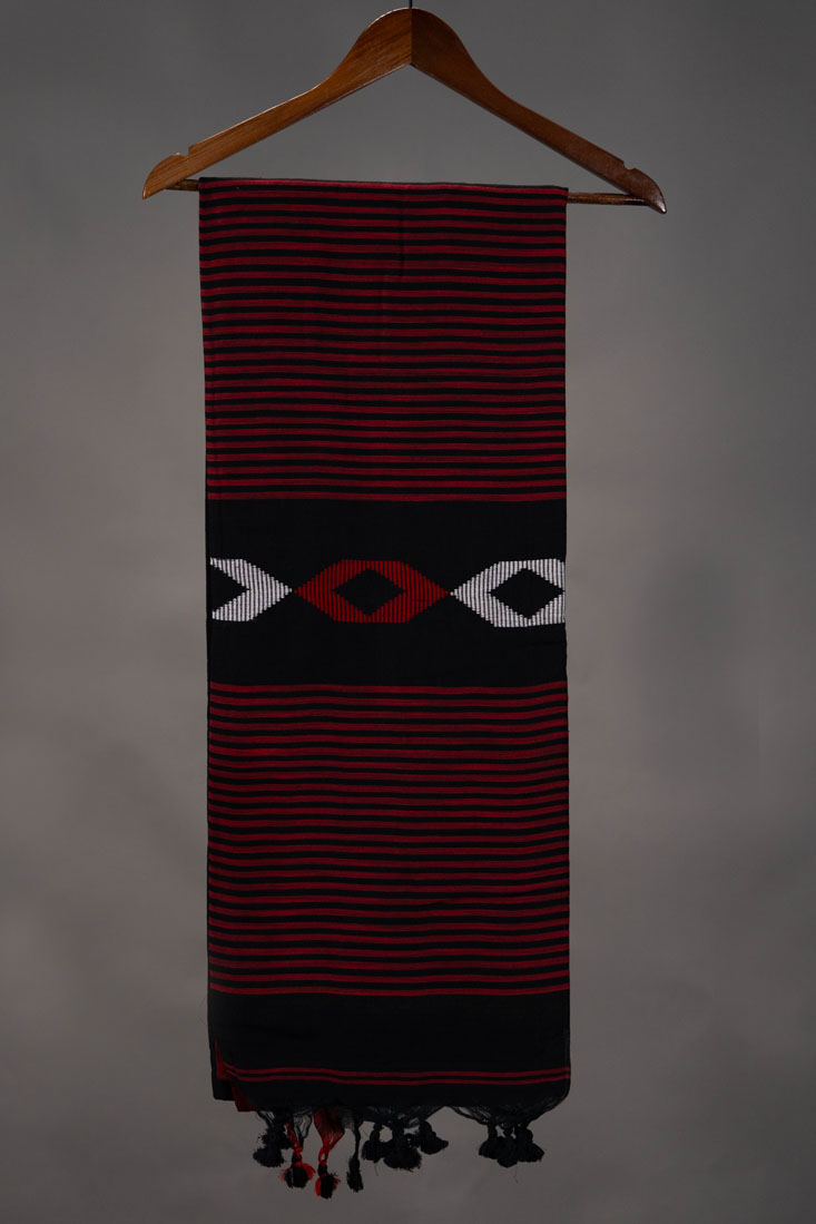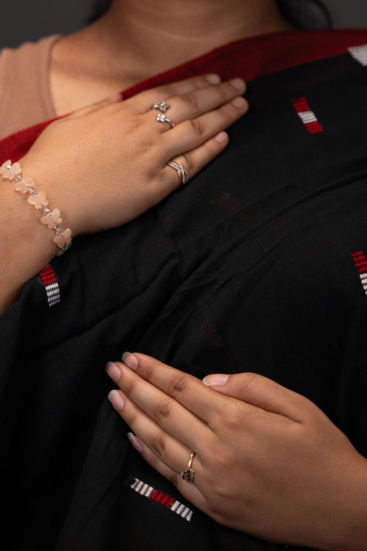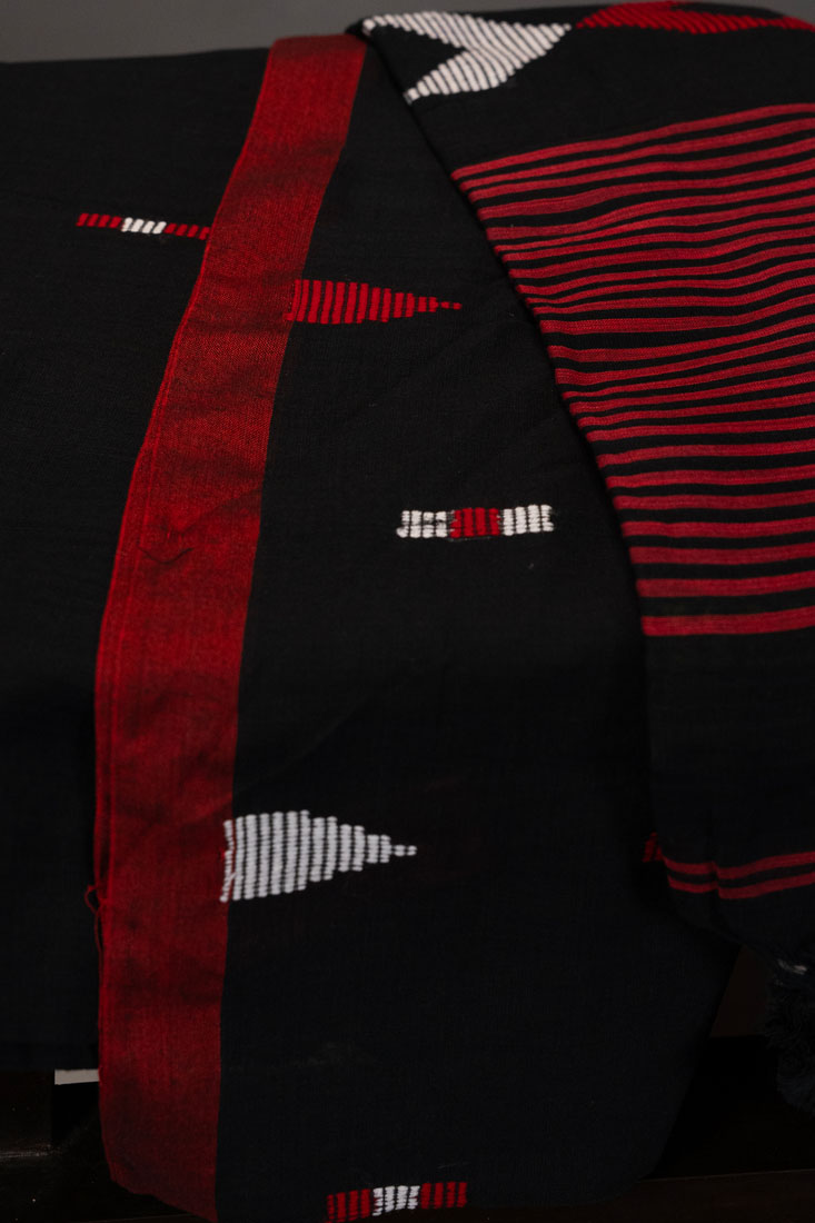 Skillfully woven by master artisans, this saree highlights Khadi’s rich texture through striking design elements. Vivid red and white geometric panels and clean stripes energize the pallu and borders, while abstract butis subtly punctuate the deep black body—infusing a modern spirit into timeless handloom craft.