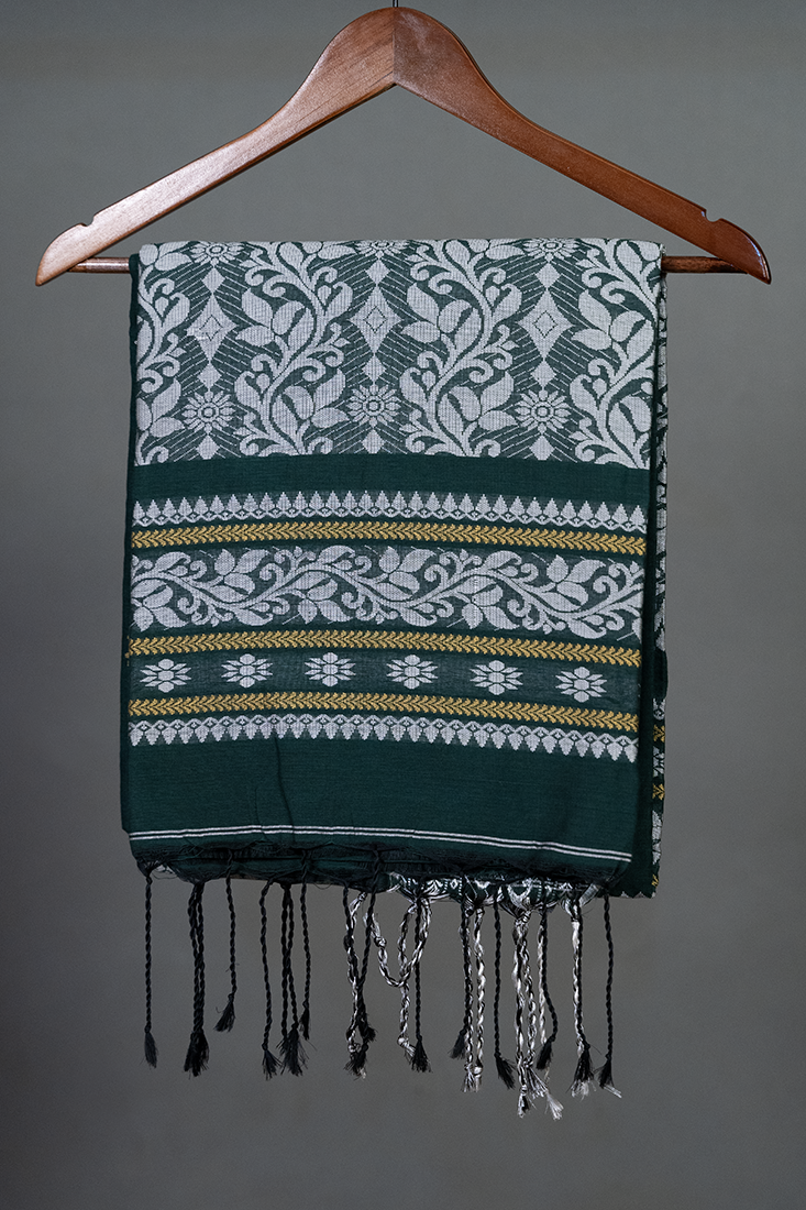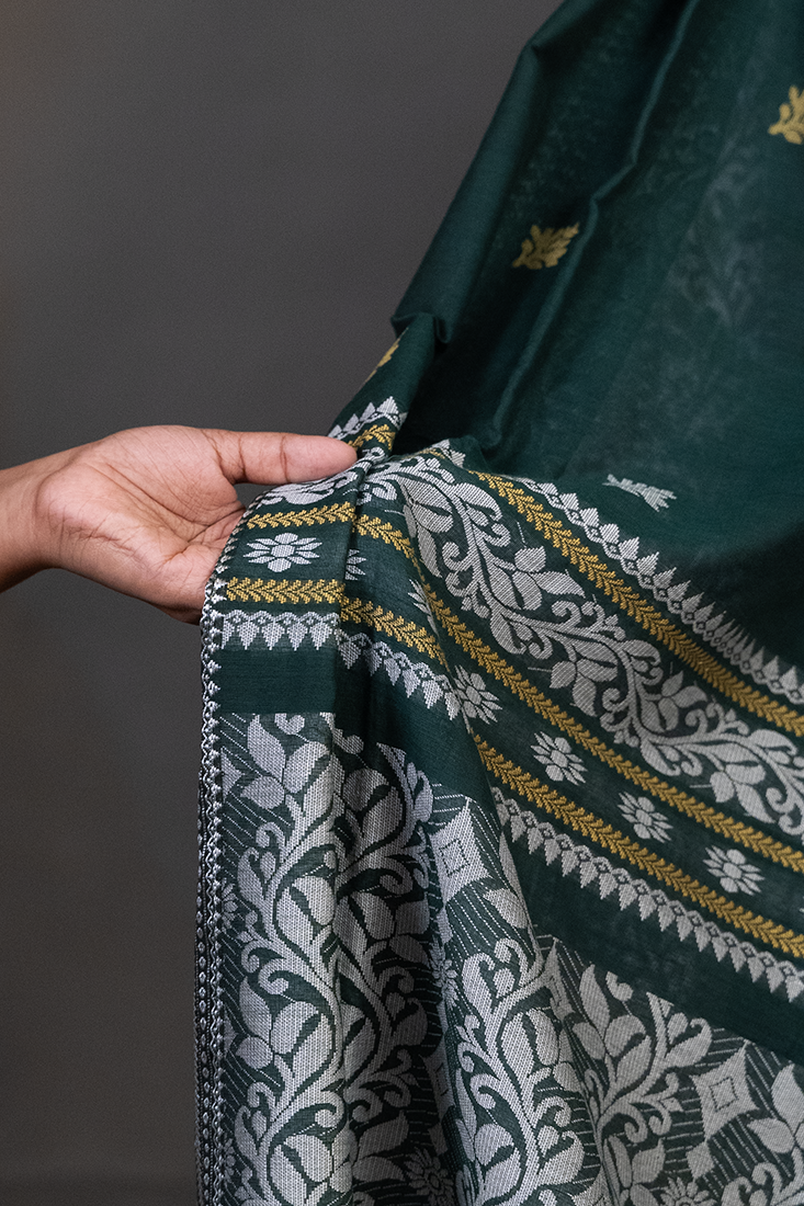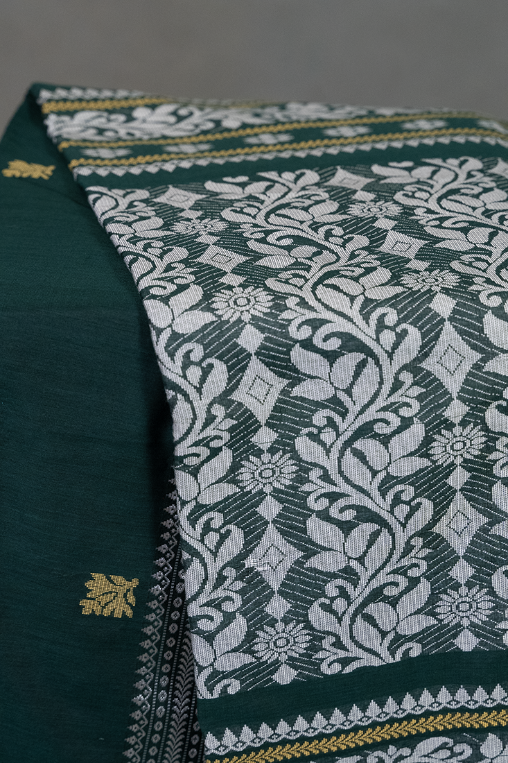 Celebrate nature's serenity in this fresh green cotton saree, Hand-Stitched by master artisans in Phulia, Nadia—the legendary home of Bengal's finest Tant weaving.