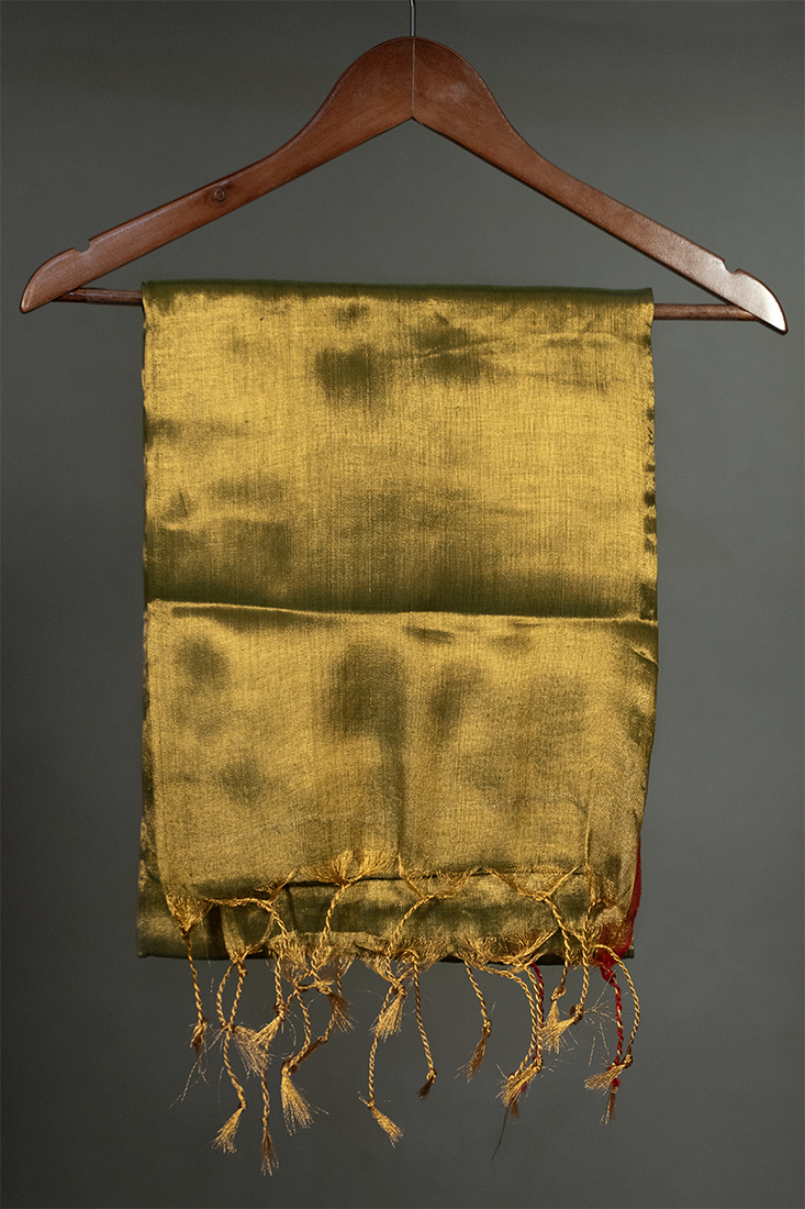 Explore eco-luxury in this olive green Tissue silk saree, Handwoven by skilled artisans in Phulia, NadiaโBengalโs legacy weaving village.