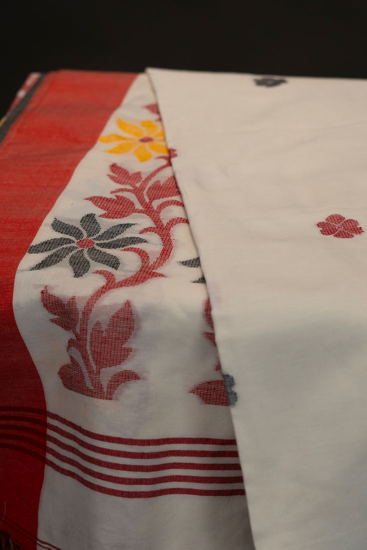 Step into timeless elegance with this white pure cotton saree, a classic Jamdani handloom from Phulia, West Bengal.